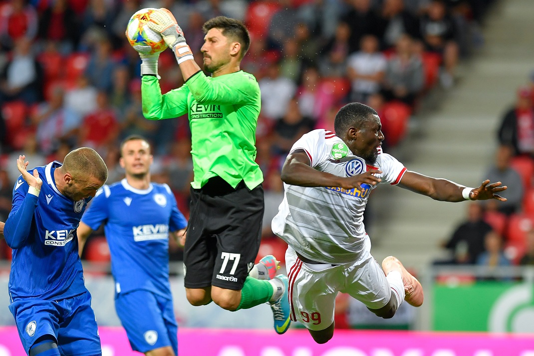 Borítókép: A debreceni Haruna Garba (j) valamint Olsi Teqja (b) és Stivi Frasheri (k) kapus, az albán csapat játékosai a labdarúgó Európa Liga selejtezőjének első fordulójában játszott Debreceni VSC – FK Kukesi mérkőzésen a debreceni Nagyerdei Stadionban 2019. július 11-én. Debreceni VSC – FK Kukesi 3-0. MTI/Czeglédi Zsolt