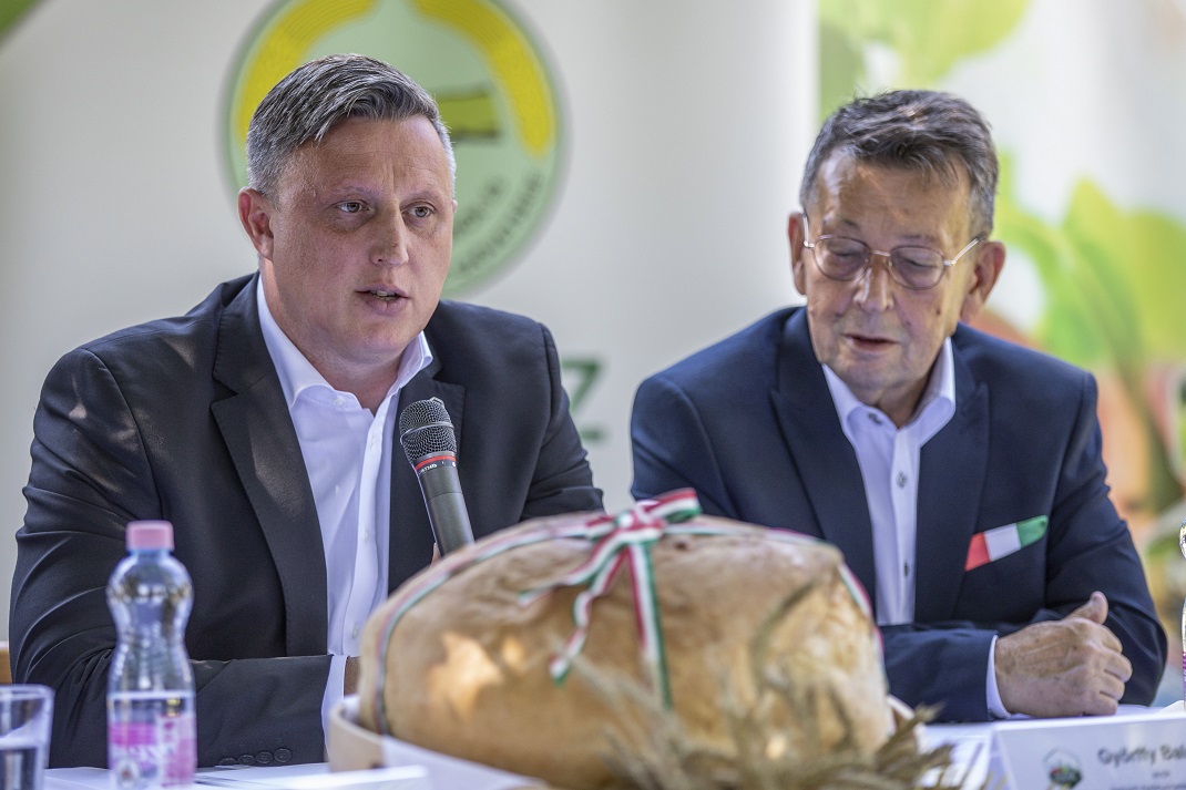 Nyitókép: Győrffy Balázs, a Nemzeti Agrárgazdasági Kamara elnöke (b) és Babák Mihály polgármester a Magyarok Kenyere – 15 millió búzaszem program sajtótájékoztatóján Szarvason 2020. július 9-én. MTI/Rosta Tibor