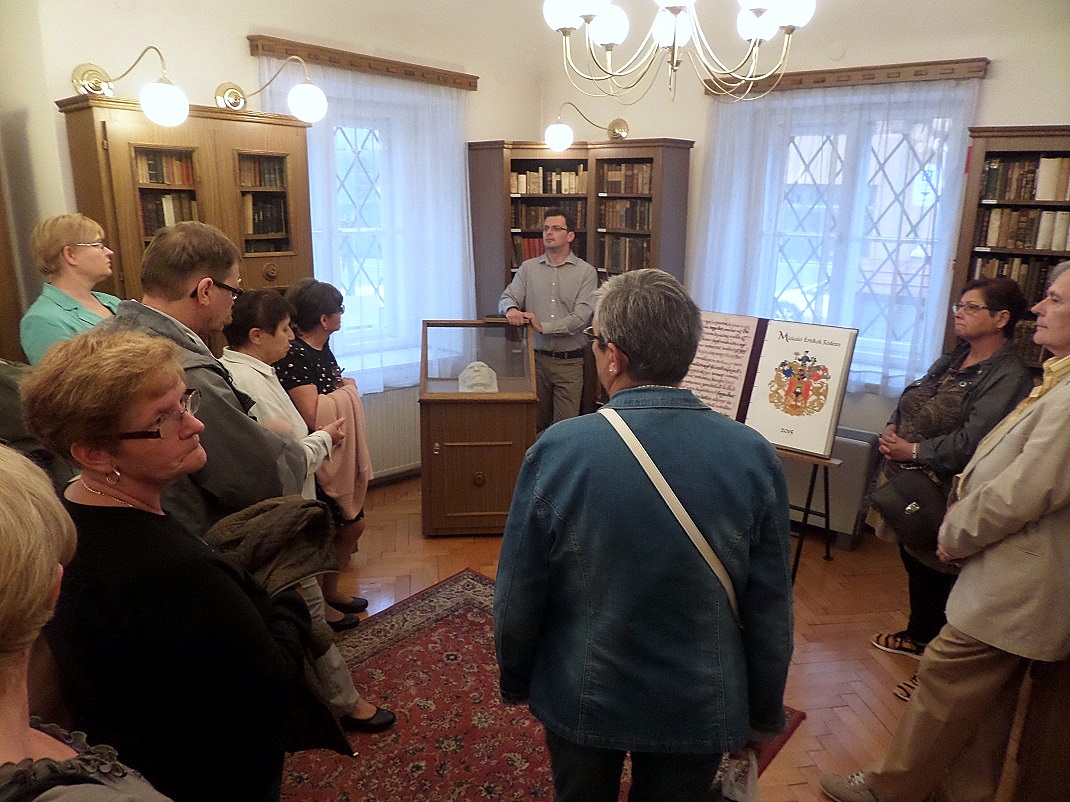 A vitrinben Lévay József halotti maszkja (Varga Gábor igazgató tartott idegenvezetést a könyvtárban)