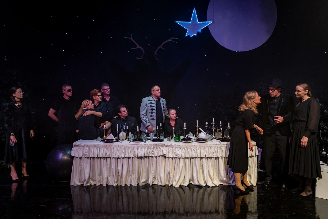 A gyorsan lepergő száz év színpadra állítása természetesen komoly látványbeli kihívás is volt. A történet egy család nappalijában játszódik, az ünnepi asztal mellett. A szerzőnek volt egy határozott elképzelése a díszletről, de Kovács Lehel végül más vizuális világ mellett döntött.